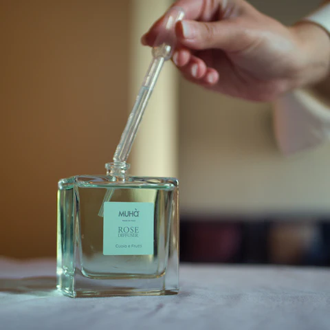 Een verfijnde verpakking in een glazen fles, met een diffuser in de vorm van een roos, handgemaakt van natuurlijk berkenhout. Compleet met essentie.